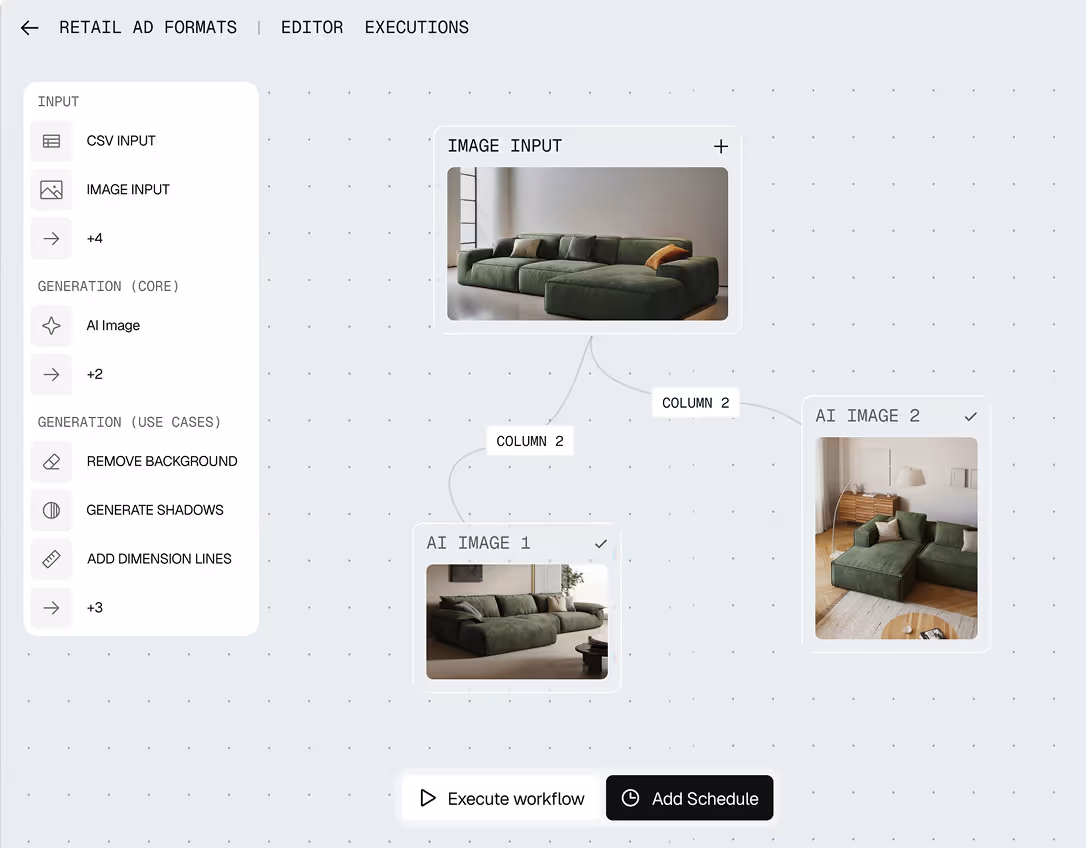 Stop creating visuals one by one. Build custom AI workflows that run your entire catalog in hours.